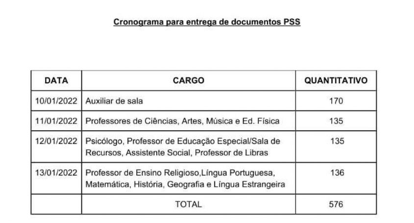 No dia 10, comparecerão os aprovados para o cargo de auxiliar de sala. No dia 11, será a vez dos professores de Ciência, Artes, Músicas e Educação Física. No dia 12, entregam a documentação os psicólogos, os professores de educação especial/sala de recursos, assistentes sociais e professor de Libras. Por fim, no dia 13, será a vez dos aprovados para os cargos de professor de Ensino Religioso, Língua Portuguesa, Matemática, História, Geografia e Língua Estrangeira.