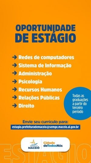 A Secretaria Municipal de Gestão, da Prefeitura de Maceió, está com inscrições abertas para estágio de estudantes universitários a partir do terceiro período de formação. As áreas de atuação são Redes de Computadores, Sistema de Informação, Administração de Empresas, Psicologia, Recursos Humanos, Relações Públicas e Direito.