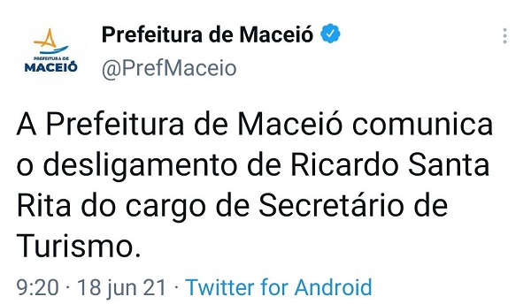A Prefeitura de Maceió comunicou, por meio de conta oficial no Twitter, a exoneração do secretário de Turismo, Esporte e Lazer, Ricardo Santa Ritta. A decisão aconteceu um dia depois de Santa Ritta publicar um Tweet onde defendia do uso da suástica, um símbolo nazista, como "liberdade de expressão". A fala ganhou repercussão nacional e o secretário chegou a pedir desculpas nas redes. No comunicado (leia abaixo), a Prefeitura não comentou o teor do post que provocou o desligamento.