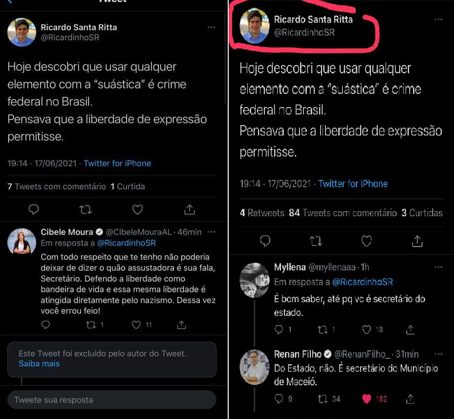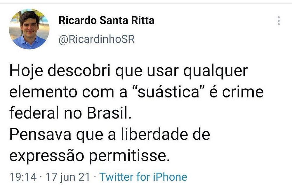 Após a repercussão negativa da postagem, o secretário adotou um tom diferente nas publicações seguintes. “O Brasil tem mais artigo de lei que habitante. Hoje tomei conhecimento que usar símbolo da suástica é crime federal. Sinceramente, não sabia. O post anterior foi uma opinião pessoal minha. Achei interessante a discussão sobre liberdade de expressão por consequência disto”, explicou, sem convencer muitos os internautas, que continuam repercutindo negativamente a fala de Santa Rita..
