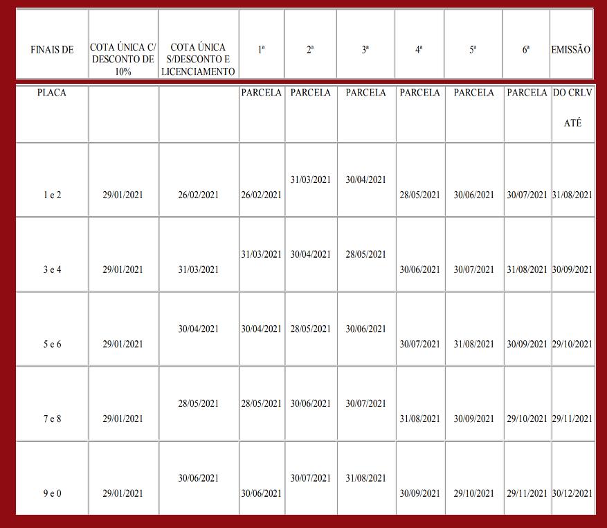Cada final de placa possui uma data-limite para pagamento da cota única sem desconto ou da primeira parcela. As placas de finais 1 e 2 têm até 26 de fevereiro; placas de finais 3 e 4 até 31 de março; placas de finais 5 e 6 até 30 de abril; placas de finais 7 e 8 até 28 de maio e as placas de finais 9 e 0 até 30 de junho. O valor mínimo de cada parcela – que pode ser dividido em até seis vezes – não poderá ser inferior a R $100.