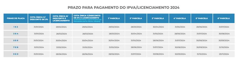 Cada final de placa possui uma data-limite para pagamento da cota única sem desconto ou da primeira parcela. As placas de finais 1 e 2 têm até 29 de fevereiro; placas de finais 3 e 4 até 28 de março; placas de finais 5 e 6 até 30 de abril; placas de finais 7 e 8 até 31 de maio e as placas de finais 9 e 0 até 28 de junho.