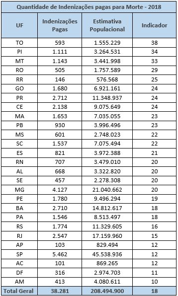 Quando observada apenas a quantidade de benefícios pagos por acidentes fatais, sem relacionar à estimativa populacional, a Região Nordeste foi a única a apresentar aumento das indenizações por morte devido a ocorrências no trânsito entre 2009 e 2018. O Maranhão foi a unidade federativa com maior crescimento (46%), seguido do Piauí (42%). Já os estados de São Paulo e Rio Grande do Sul tiveram redução de cerca de 50% nas indenizações pagas por acidentes fatais entre 2009 e 2018.