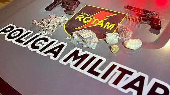 Com ele foram apreendidos um revólver calibre 38 com cinco munições intactas e outra arma de fabricação artesanal, 41 gramas de cocaína, 40 bombinhas de maconha mais uma sacola contendo mais 50 gramas da mesma droga, além de 90 comprimidos de Rophynol (medicamento com efeito entorpecente).