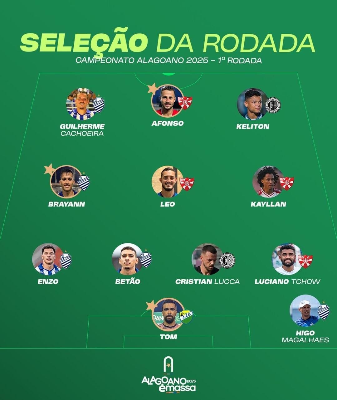 A Federação Alagoana de Futebol (FAF) divulgou a seleção dos melhores jogadores da primeira rodada nessa segunda-feira (12). A seleção teve o domínio dos jogadores do CSA e Penedense, que venceram seus jogos na primeira rodada. A eleição foi realizada com dez jornalistas das emissoras oficiais da competição.