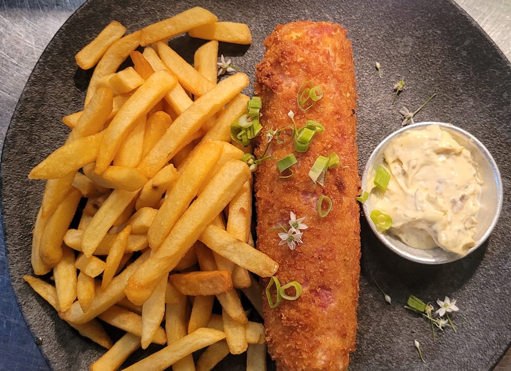 Servia: rolinho de porco empanado e recheado com mussarela e presunto, acompanhado de batata frita