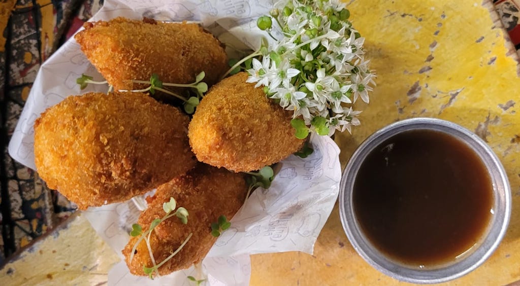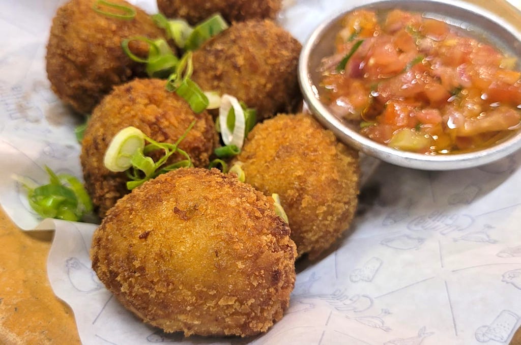 Camarões: bolinhos de banana com o crustáceo defumado ao molho lambão