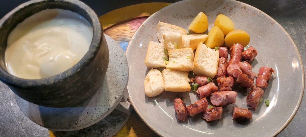 Suíça: fondue de queijos com linguiça grelhada, pão caseiro e batata bolinha