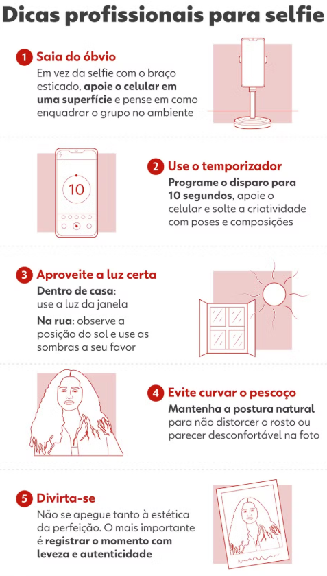 “Em caso de uma selfie, o ideal é que as pessoas estejam com os rostos na mesma direção, um ao lado do outro. Caso um esteja com o rosto um pouco mais a frente, estará mais vulnerável à distorção. E a inclinação da câmera também influencia. Basta um movimento para cima ou para baixo e já muda completamente a proporção”.