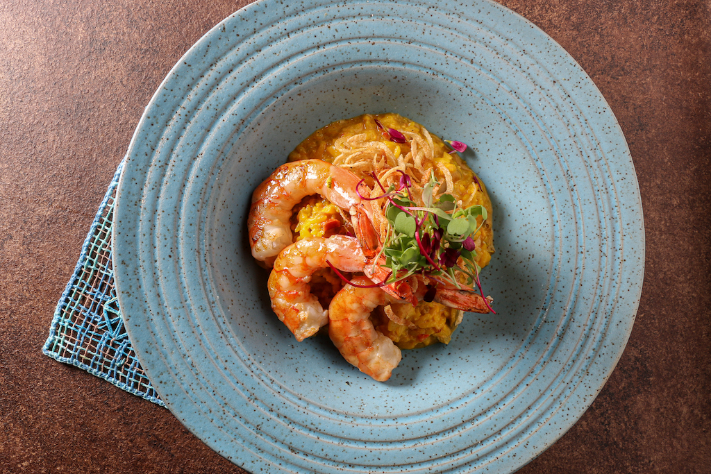 Arroz cremoso de camarão com toque de moqueca e cubos de queijo coalho