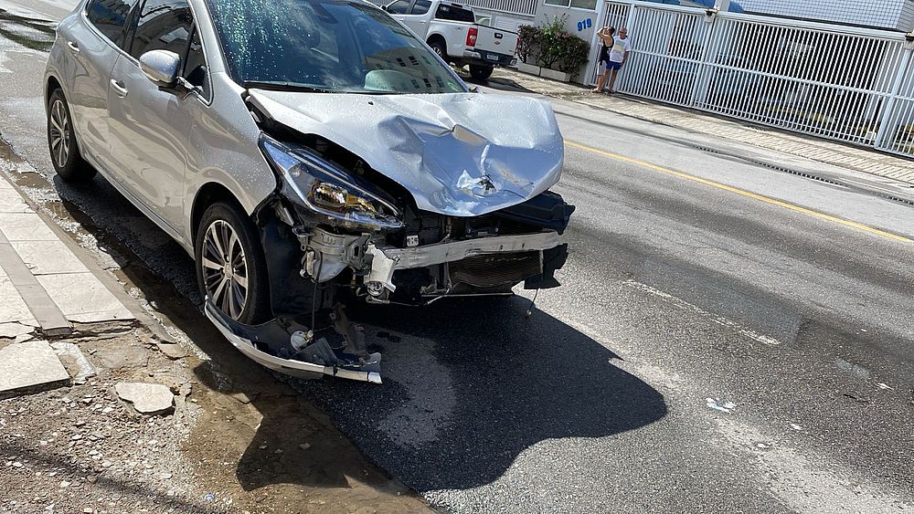 A moto foi parar alguns metros à frente após o cruzamento e bateu em um outro carro, de modelo Renault KWID, de cor branca, que estava estacionado.