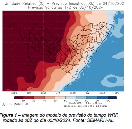 Imagem do modelo de previsão do tempo WRF, rodado às 00Z do dia 05/10/2024. Fonte: SEMARH-AL. |