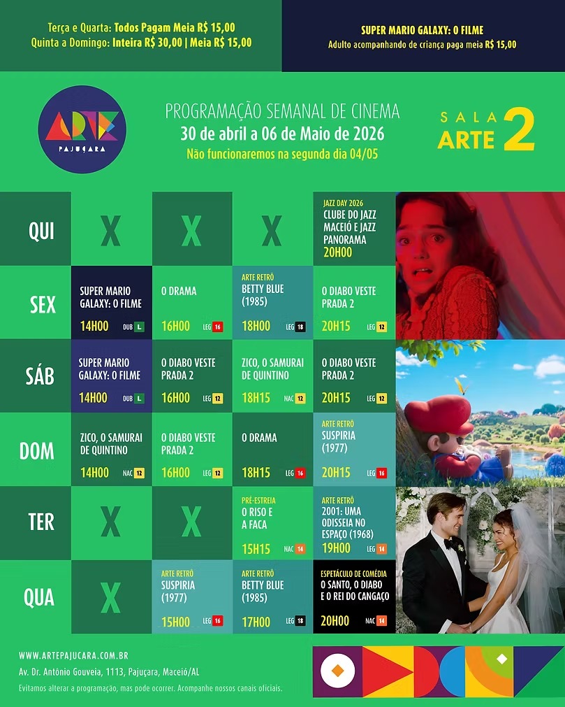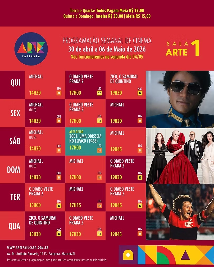 Para conferir a programação completa de todos os filmes em cartaz no Arapiraca Partage Shopping, Centerplex (Shopping Pátio Maceió), Cinesystem (Parque Shopping) e Kinoplex (Maceió Shopping): basta clicar aqui. Já para o Shopping da Vila, em Delmiro Gouveia, pode ser conferida aqui.