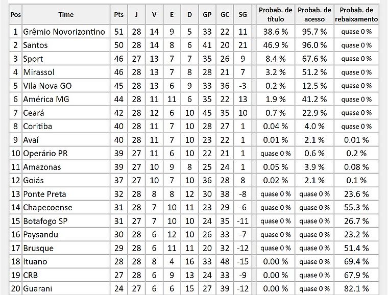 Veja abaixo as projeções do Chance de Gol após a 28ª rodada da Série B do Campeonato Brasileiro: