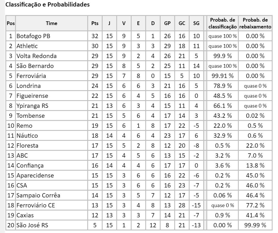 Botafogo-PB, Athletic, Volta Redonda, São Bernardo e Ferroviária são os melhores posicionados e estão praticamente classificados, com mais de 99% de chances, segundo o site Chance de Gol.