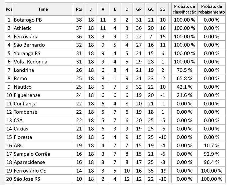 Já na batalha para escapar do rebaixamento, ABC, Sampaio Corrêa e Aparecidense vão para o tudo ou nada na rodada final. Veja as projeções feitas pelo Chance de Gol abaixo: