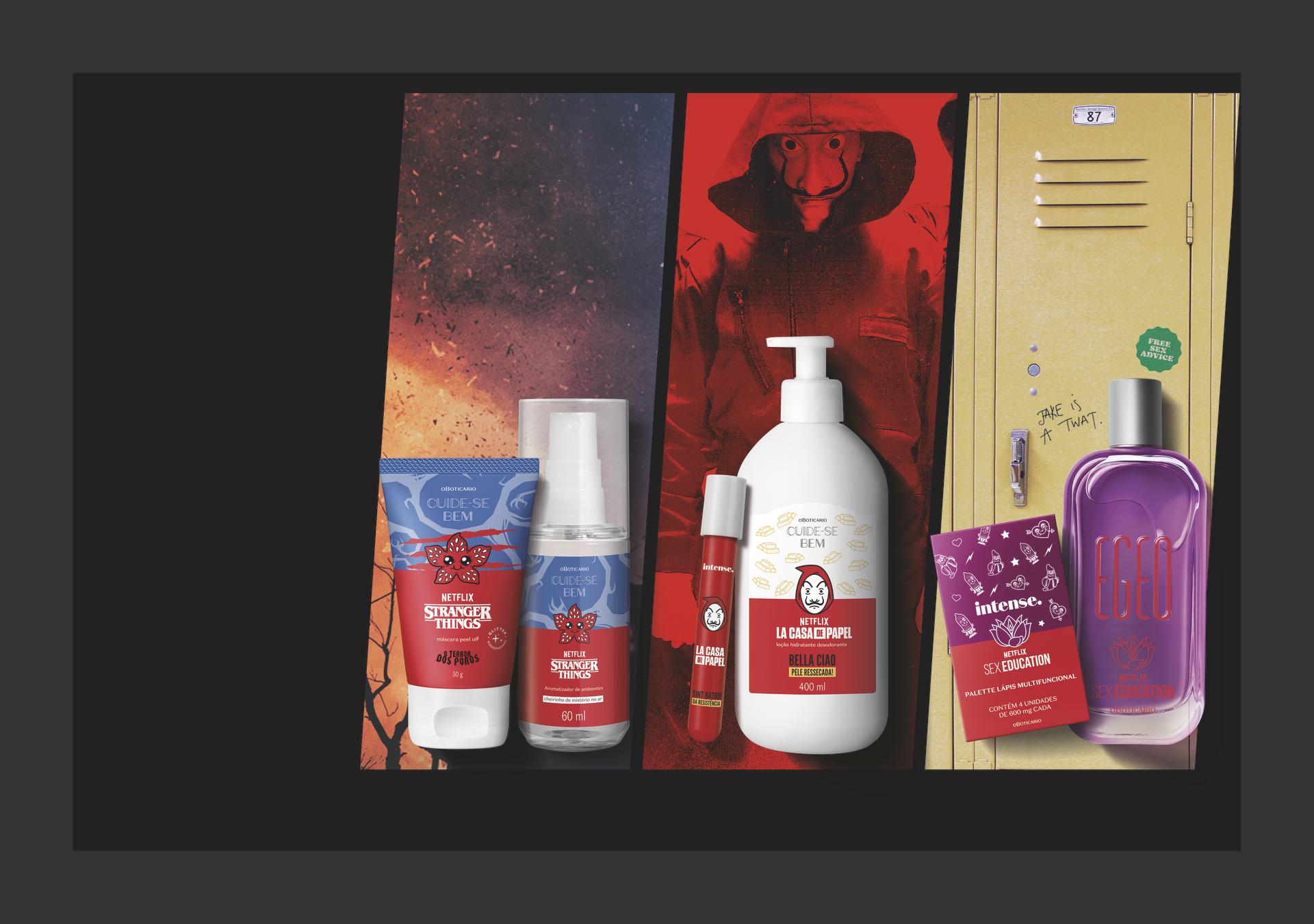 e Sex Education, tenho certeza que vai querer levar um “pedacinho” das séries pra seu dia-a-dia, isso é o que promete essa união entre Netflix e O Boticário. “Estamos muito felizes em dar continuidade a essa parceria com a Netflix, que começou entre Floratta e Bridgerton no início deste ano, e agora segue com uma collab de produtos inspirados em algumas das séries mais amadas pelos brasileiros e mundialmente. Conseguimos unificar a rotina de autocuidado com produtos de cuidados facial e corporal, aromatizador de ambiente, maquiagem e perfumaria, com o momento de descontração e relaxamento que existe ao maratonar uma série. Mais uma vez, observamos que o movimento de colaboração entre marcas que têm sinergia entrega estrategicamente para a geração de valor e de consumo”, aponta Renata Gomide, Diretora de Marketing do Grupo Boticário.