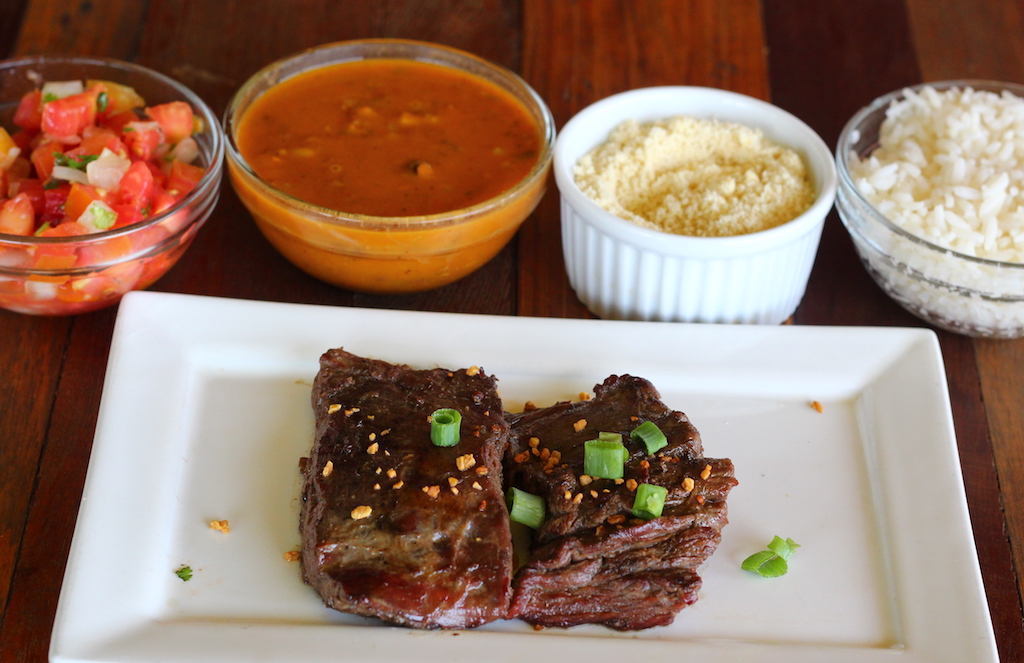 Fraldinha grelhada com arroz, feijão e vinagrete