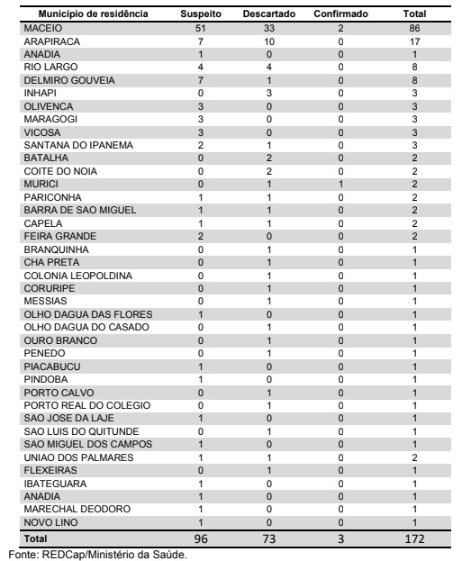"Até o dia 31/08, foram notificados 172 casos suspeitos de Monkeypox, dos quais, 03 (1,7%) casos foram confirmados, 73 (42,4%) foram descartados e 96 (55,8%) encontram-se em investigação. Além disso, verifica-se que o município de Maceió é o que possui o maior quantitativo de casos (86; 50,0%) seguido de Arapiraca (17; 9,9%), Delmiro Gouveia e Rio Largo com (8; 4,7%) respectivamente", diz o boletim da Sesau.