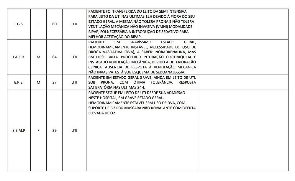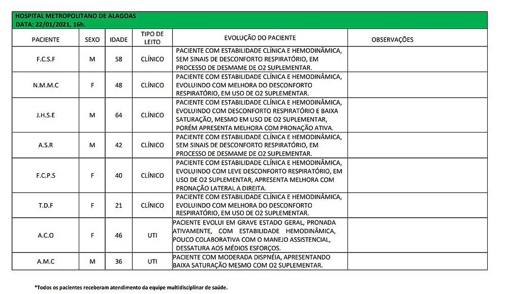 Veja aqui o Boletim Médico dos 14 pacientes de Manaus:
