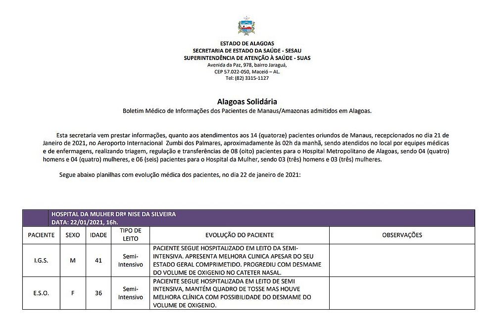 Os pacientes foram trazidos para Maceió na última quinta-feira (21), durante a Operação Alagoas Solidária. O translado ocorreu em decorrência do colapso da rede hospitalar em Manaus. Situação que resultou, inclusive, na falta de cilindros de oxigênio nas unidades de saúde manauaras, conforme divulgado pela própria Secretaria de Estado de Saúde do Amazonas (SES/AM).