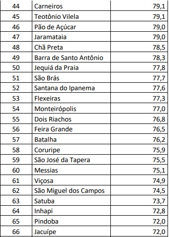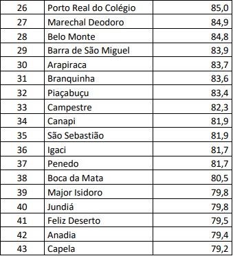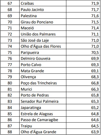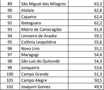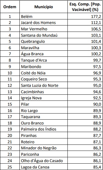 O ranking traz os 102 municípios alagoanos e disponibiliza o percentual de imunização na população no geral e o percentual de imunização na população vacinável. Os dados da vacinação no geral dependem da quantidade de pessoas residentes no município, por isso, o percentual de pessoas vacinadas é maior quando calculado a partir da população vacinável em comparação com a população geral. O percentual de vacinados na população geral é menor, já que desconsidera a faixa etária que ainda não pode se vacinar.