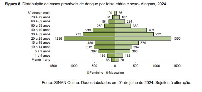 O informe sobre a situação epidemiológica da dengue em Alagoas mostra também que o sexo feminino apresenta uma discreta predominância em relação ao número de casos registrados no estado (53,4%). A faixa etária onde é registrada a maioria dos casos é entre pessoas de 20 e 29 anos (25,7%). Já a faixa etária que menos possui registros de casos e a de indivíduos com idade acima de 80 anos (0,6%).