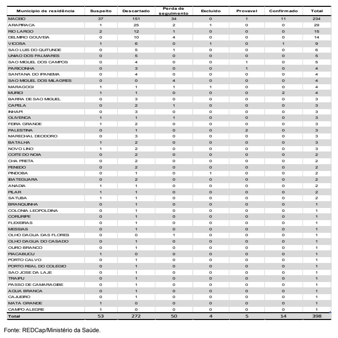 Além disso, verifica-se que o município de Maceió é o que possui o maior quantitativo de casos (234;58,8%) seguido de Arapiraca (29; 7,3%) e Rio Largo com (15; 3,8%) respectivamente. Foram excluídos 04 casos por não atenderem definição proposta pelo Ministério da Saúde dos seguintes municípios: Arapiraca, Pindoba, Maragogi e Viçosa. Veja o boletim completo.