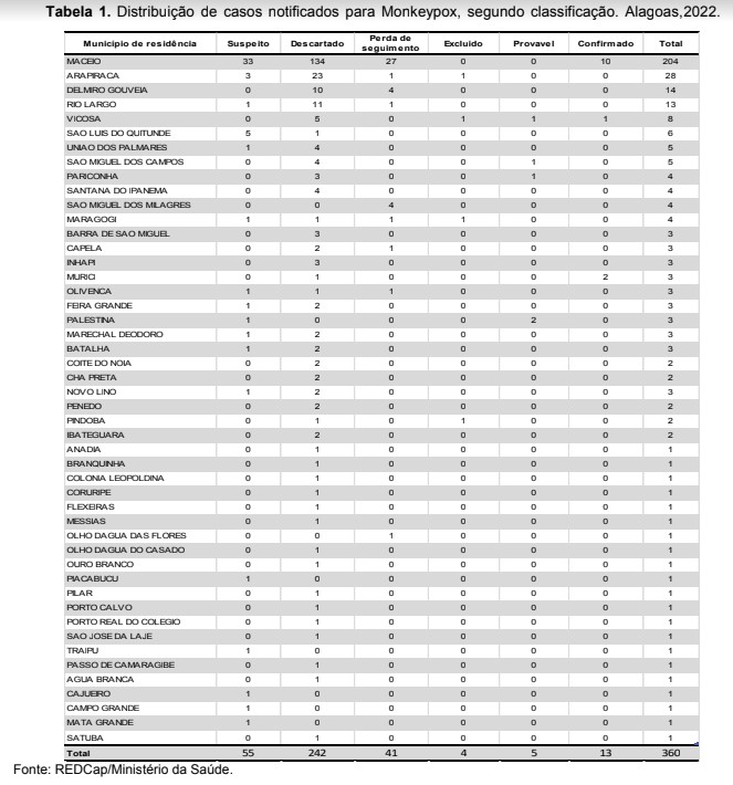 O número de casos suspeitos em investigação de monkeypox, a varíola dos macacos, subiu para 55, nesta sexta-feira, 7, de acordo com o boletim da Secretaria de Estado da Saúde (Sesau). Até agora foram notificados 360 casos suspeitos da doença no Estado, dos quais 242 foram descartados. A Sesau confirmou 13 casos, dos quais dez são de Maceió, um de Viçosa, e dois de Murici.