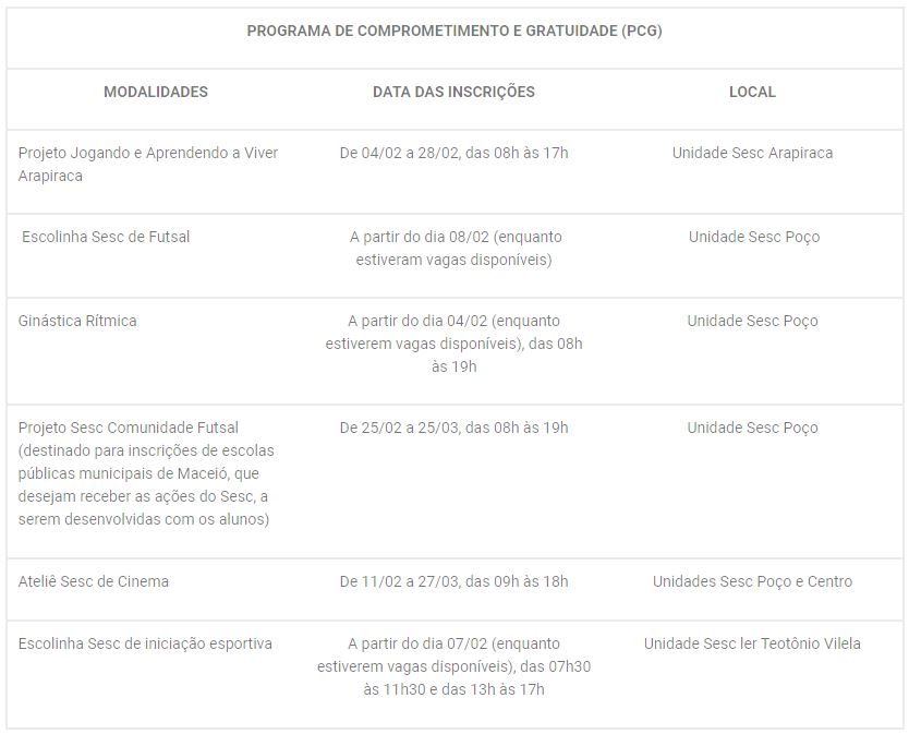 O Sesc Alagoas lança editais para o preenchimento de vagas destinadas ao Programa de Comprometimento e Gratuidade (PCG) através da realização de projetos que oferecem aulas de iniciação esportiva nas modalidades, futsal, ginástica rítmica, dentre outras, além de oficinas de cinema, ações educativas. As aulas serão realizadas na Unidades Sesc Poço e Guaxuma em Maceió e no interior na Unidade Sesc Arapiraca.