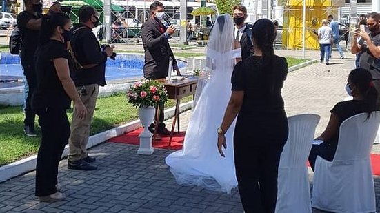 Trabalhadores do setor de eventos realizaram um casamento simbólico, no Centro de Maceió, nesta sexta-feira (7), a fim de pedir pela flexibilização das medidas de restrições da fase vermelha, que proíbe eventos públicos ou privados.