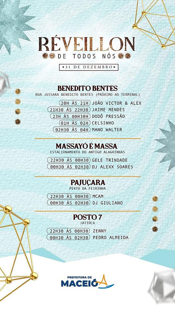 A Prefeitura de Maceió realizará mais uma edição do Réveillon de Todos Nós. Com música, alegria e diversão, a programação acontecerá no Benedito Bentes; no espaço Massayó É Massa, na Ponta Verde, e nos bairros da Jatiúca e Pajuçara. Além das atrações, o evento também contará com a tradicional queima de fogos.
