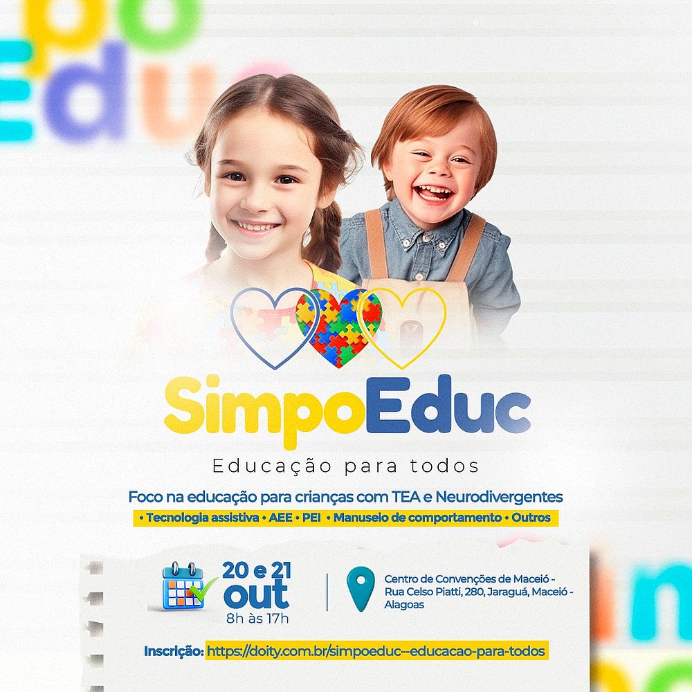 Os desafios da educação inclusiva e da pluralidade no ambiente educacional são os focos do SimpoEduc- Educação Para Todos, que acontecerá nos dias 20 e 21 de outubro, no Centro de Convenções de Maceió. Partindo do princípio da garantia do direito de todos à educação, serão debatidos temas que ampliam as possibilidades de aprendizagem, especialmente para crianças com Transtorno do Espectro Autista e deficiências intelectuais.