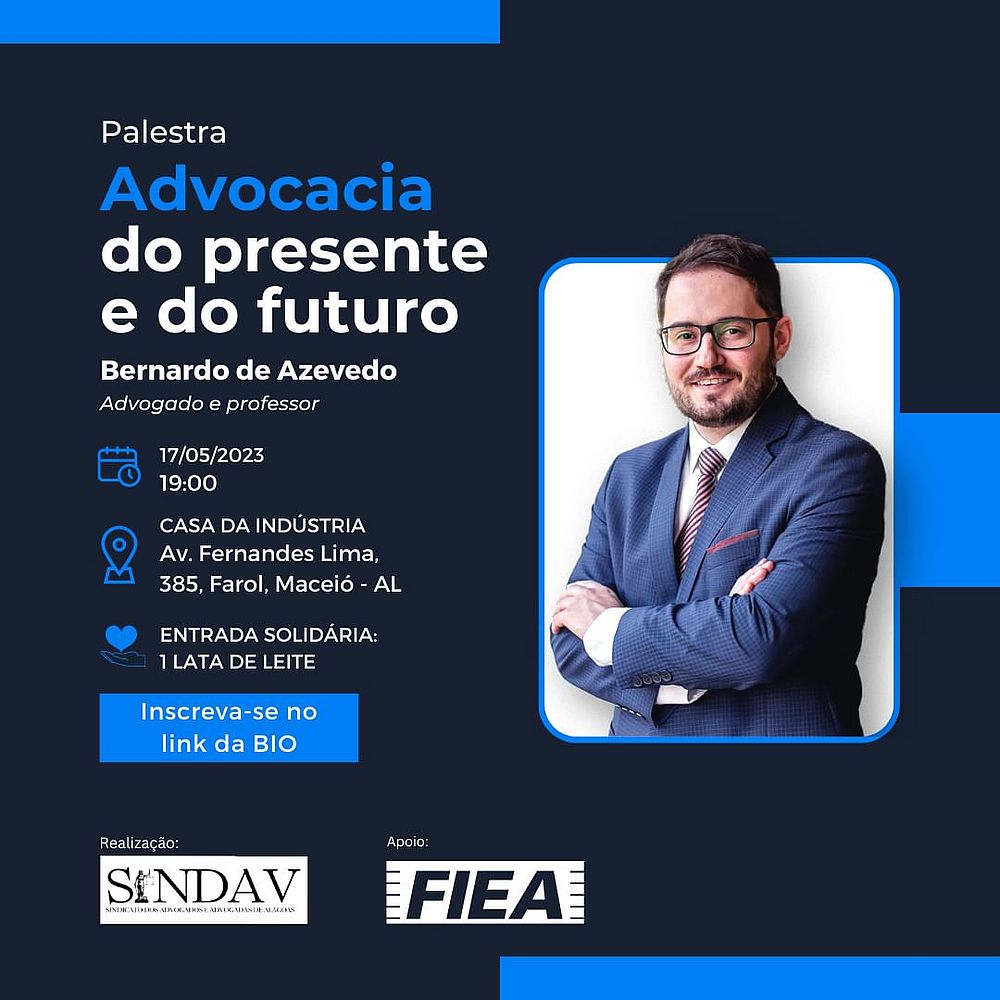Com o avanço das tecnologias na atuação dos advogados de todo o país, o Sindicato dos Advogados de Alagoas (SINDAV) irá promover uma palestra com o tema “Advocacia do presente e do futuro”, ministrada pelo advogado e professor Bernardo de Azevedo. O evento, que contará com a parceria do Federação das Indústrias do Estado de Alagoas (FIEA), acontecerá no próximo dia 17 de maio, às 19h, no auditório da Casa da Indústria, Farol.