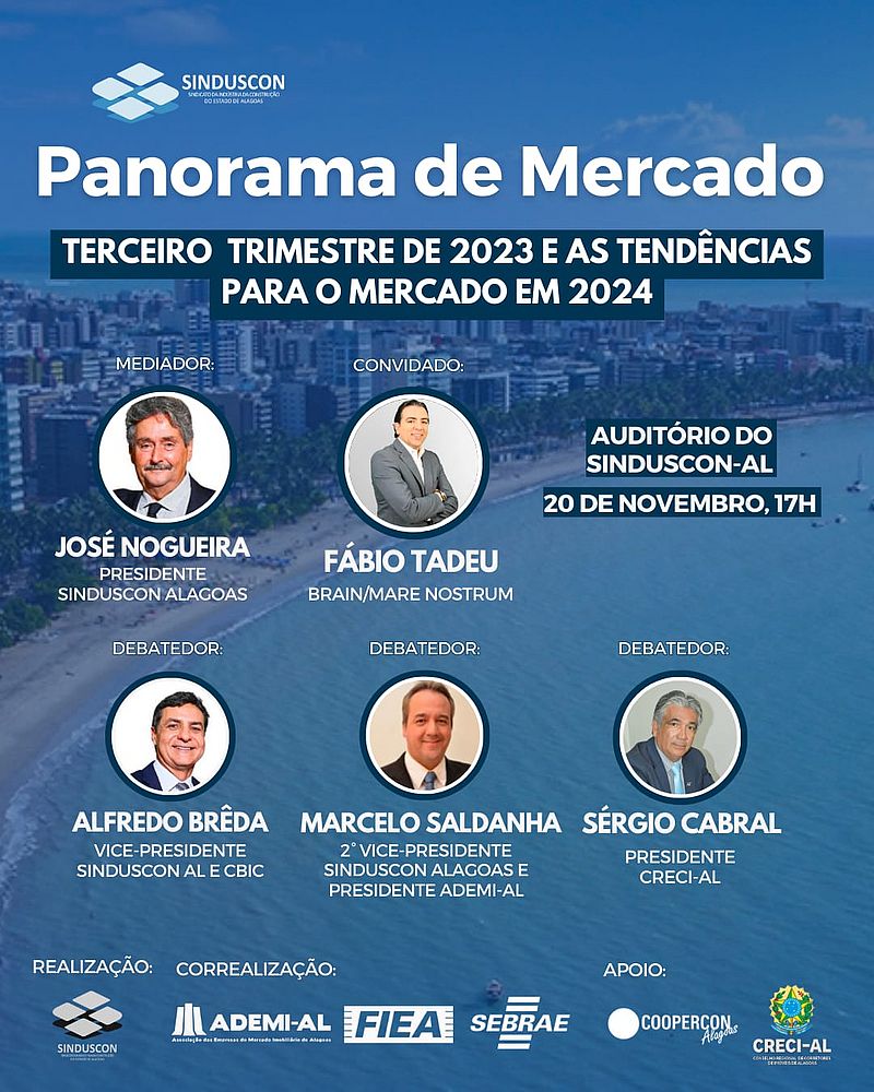A discussão vai abordar o terceiro trimestre de 2023 e as tendências para o mercado em 2024. O mediador será o presidente do Sinduscon-AL, José Nogueira, tendo como convidado Fábio Tadeu, da Brain/Mare Nostrum.