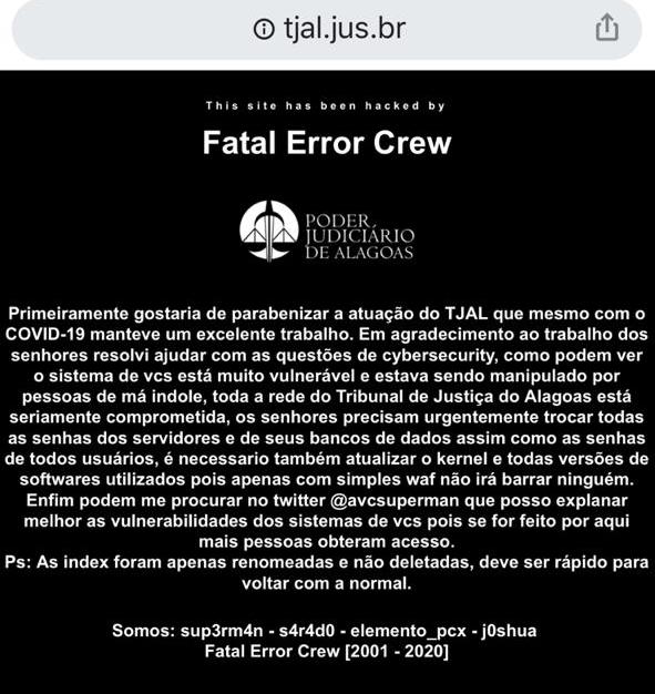 A assessoria de comunicação do Tribunal de Justiça confirmou, por meio de nota, na manhã deste sábado, 16, que o site oficial do TJ foi alvo de um cibertaque de hackers. Um "recado" deixado por supostos hackers na página principal parabeniza o trabalho do TJ, mas alerta para a vulnerabilidade do site. O susposto hacker ainda sugere que o site está sendo "manipulado por pessoas de má índole e que toda a rede do Tribunal de Justiça está seriamente compormetida".
