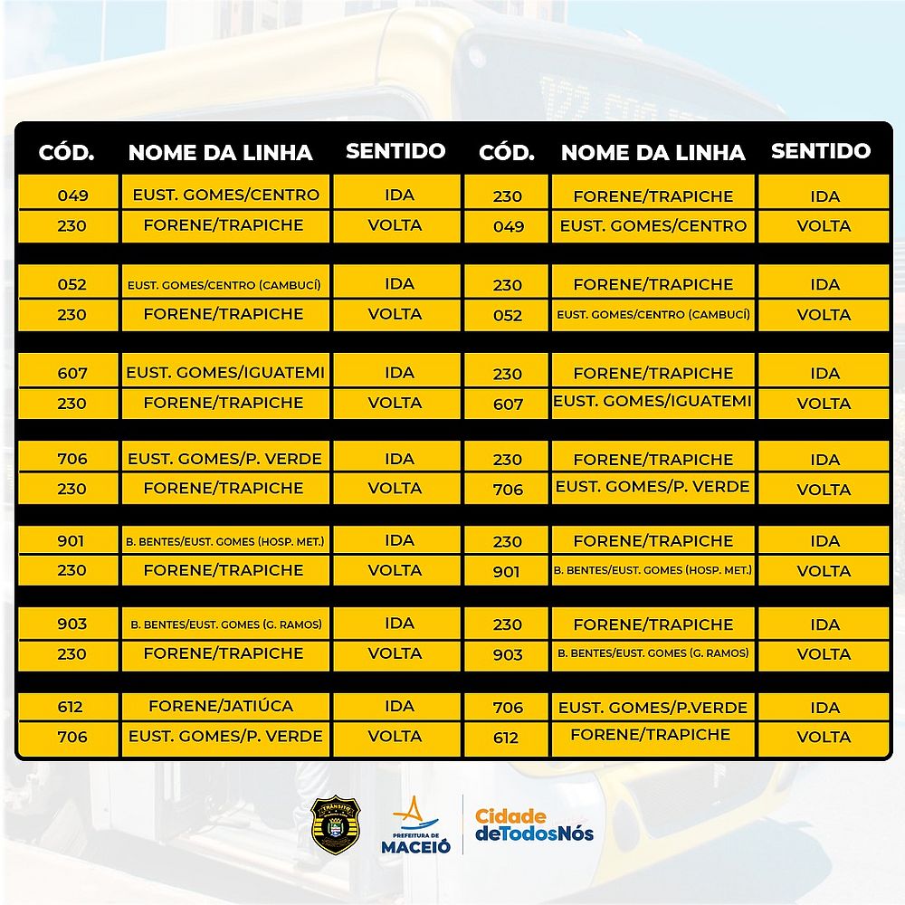 Mudança de Itinerário -A linha 230 – Forene/Trapiche, não acessará mais o bairro do Eustáquio Gomes e os conjuntos Novo Jardim e Jardim Royal. Esse trajeto passa a ser realizado pela linha 049 – Eustáquio Gomes/Centro – Trapiche (Via Vergel do Lago e Joaquim Leão).