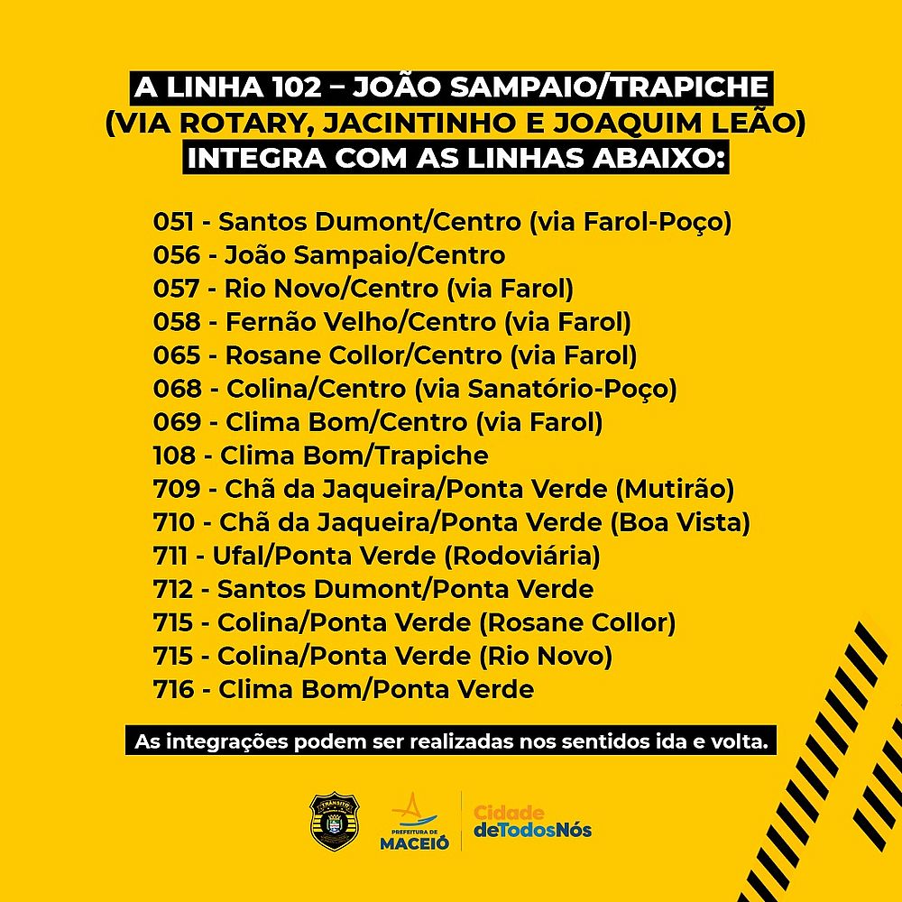 Também foram disponibilizadas as seguintes integrações para a linha 102 – João Sampaio/Trapiche com as linhas 051 – Santos Dumont/Centro (via Farol-Poço), 056 – João Sampaio/Centro, 057 – Rio Novo/Centro (via Farol), 058 – Fernão Velho/ Centro (via Farol), 065 – Rosane Collor/Centro (via Farol), 068 – Colina/Centro (via Sanatório-Poço), 069 – Clima Bom/Centro (via Farol), 108 – Clima Bom/Trapiche, 7090 – Chã da Jaqueira/Ponta Verde (Mutirão), 710 – Chã da Jaqueira/Ponta Verde (Boa Vista), 711 – Ufal/Ponta Verde(Rodoviária), 712 – Santos Dumont/Ponta Verde, 715 – Colina/Ponta Verde (Rosane Collor), 715 – Colina/Ponta Verde (Rio Novo), 716 – Clima Bom/Ponta Verde.