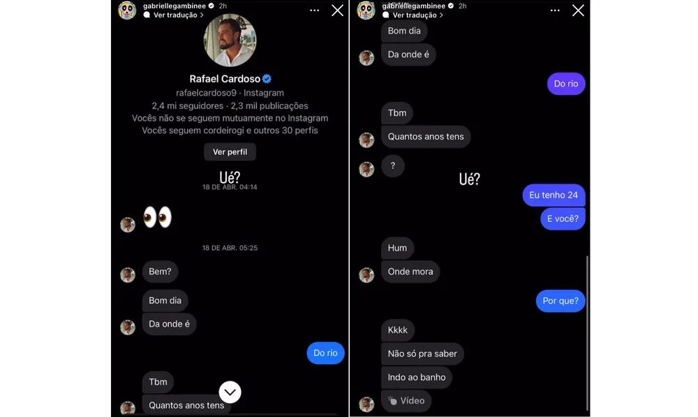 Pelos stories do Instagram, a moça compartilhou uma publicação falando sobre a crítica de Rafael a João Guilherme: "Na cabeça do Rafael Cardoso é normal ele trair a mulher dele, mas é errado o João Guilherme usar cropped e leque". Depois, Gabrielle mostrou mensagens enviadas pelo ator nas quais ele pergunta, às cinco da manhã, de onde ela é e quantos anos ela tem. Por fim, a atriz mostra que recebeu uma foto temporária do ator, que avisou que estava entrando no banho antes de mandar a imagem.