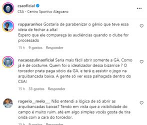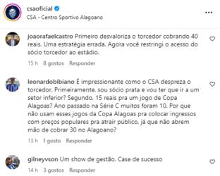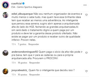 Na postagem do clube nas redes sociais, os torcedores se manifestaram. “Se você não vai disponibilizar o setor destinado ao sócio prata, o correto é fazer um upgrade gratuito e não o contrário. Isso é básico”, disse um. “Aí quer dizer que eu pago sócio da alta e serei obrigada a ir para a baixa? Melhor pagar sócio bronze, porque tá na baixa e quando a baixa fecha, vai para a alta”, disse outra.