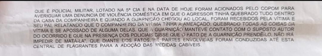 No entanto, o que causa medo na família é que durante a prisão o homem teria dito na presença dos policiais que “o fato de prendê-lo, não iria impedir de matá-la”. Confira a denúncia no Boletim de Ocorrência: