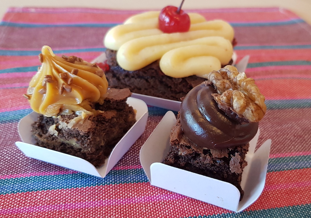 Os brownies têm nos sabores de tradicional, nozes, doce de leite, amendoim com caramelo salgado e cereja. A receita do Marcos leva chocolate meio amargo, açúcar, manteiga, chocolate em pó, farinha de trigo e ovos, mas ele fez suas mudanças até ficar perfeito para o seu paladar.