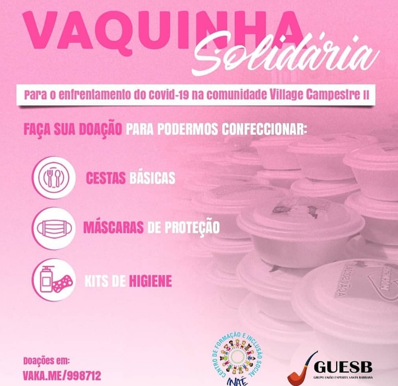No meu blog, convido você a ser parceiro com o projeto Centro de Formação e inclusão social inaê- GUESB, de doações de alimentos, material de higiene e qualquer valor que será revertido em sopa, cestas básicas e na confecção de máscaras de tecidos. Também podemos contribuir com a vakinha: https://vaka.me/998712 ou depósito na conta bancária: Banco Itaú/ Agência 8293/ Conta: 19842-3/ Grupo União Espírita Santa Barbará/ CNPJ: 06.136.631/0001-19