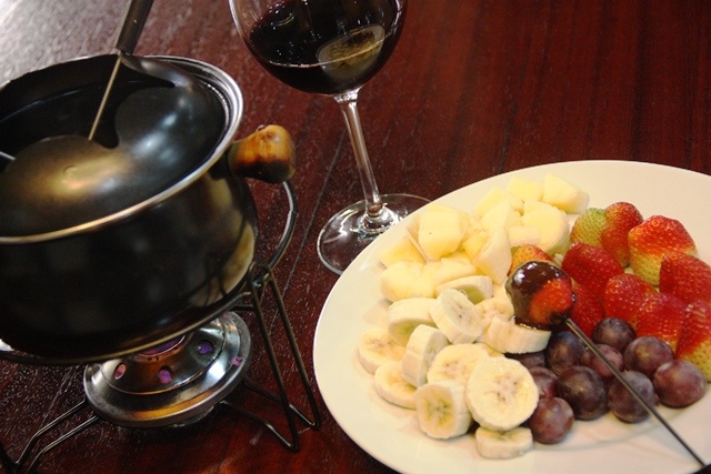 Os fãs de chocolate podem festejar. O fondue de chocolate com frutas está perfeito. O chocolate não é enjoativo e as frutas (banana, maça, morango e uva) quebram o doce. Para acompanhar a dica da gerente de Marketing do Palato, Noah Verde, é o Vinho do Porto, aprovadissímo. Também tem o fondue de queijos com pão. No mais vinho, jazz e blues, ótima pedida.