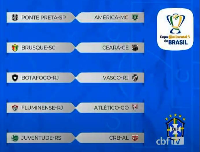 CONFRONTOS DEFINIDOS: @aapp_oficial x @AmericaMG @CearaSC x @Brusqueoficial @Botafogo x @VascodaGama @ACGOficial x @FluminenseFC @CRBoficial x @ECJuventude #SorteioCopaDoBrasil