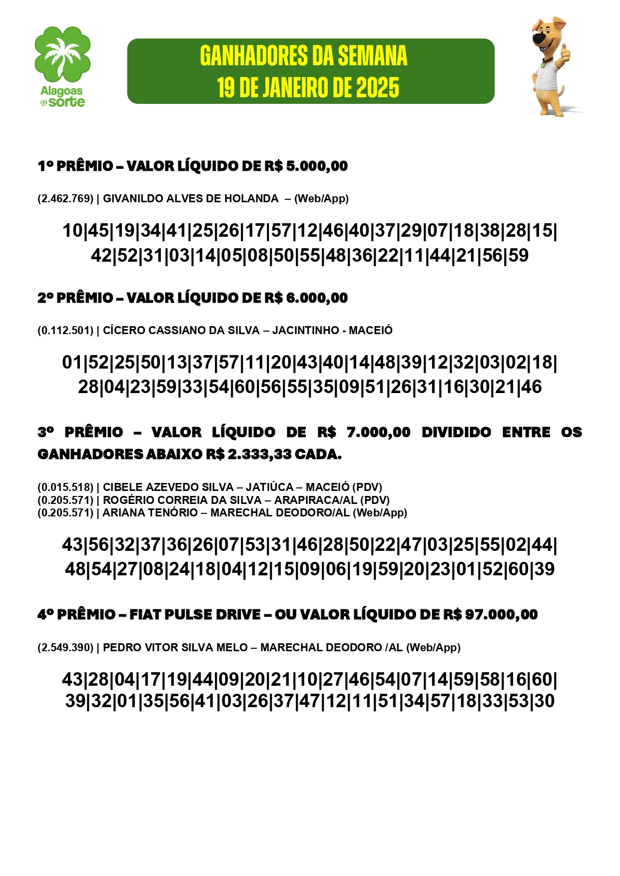 Confira os ganhadores do Alagoas dá Sorte deste domingo, dia 19 de janeiro de 2025.