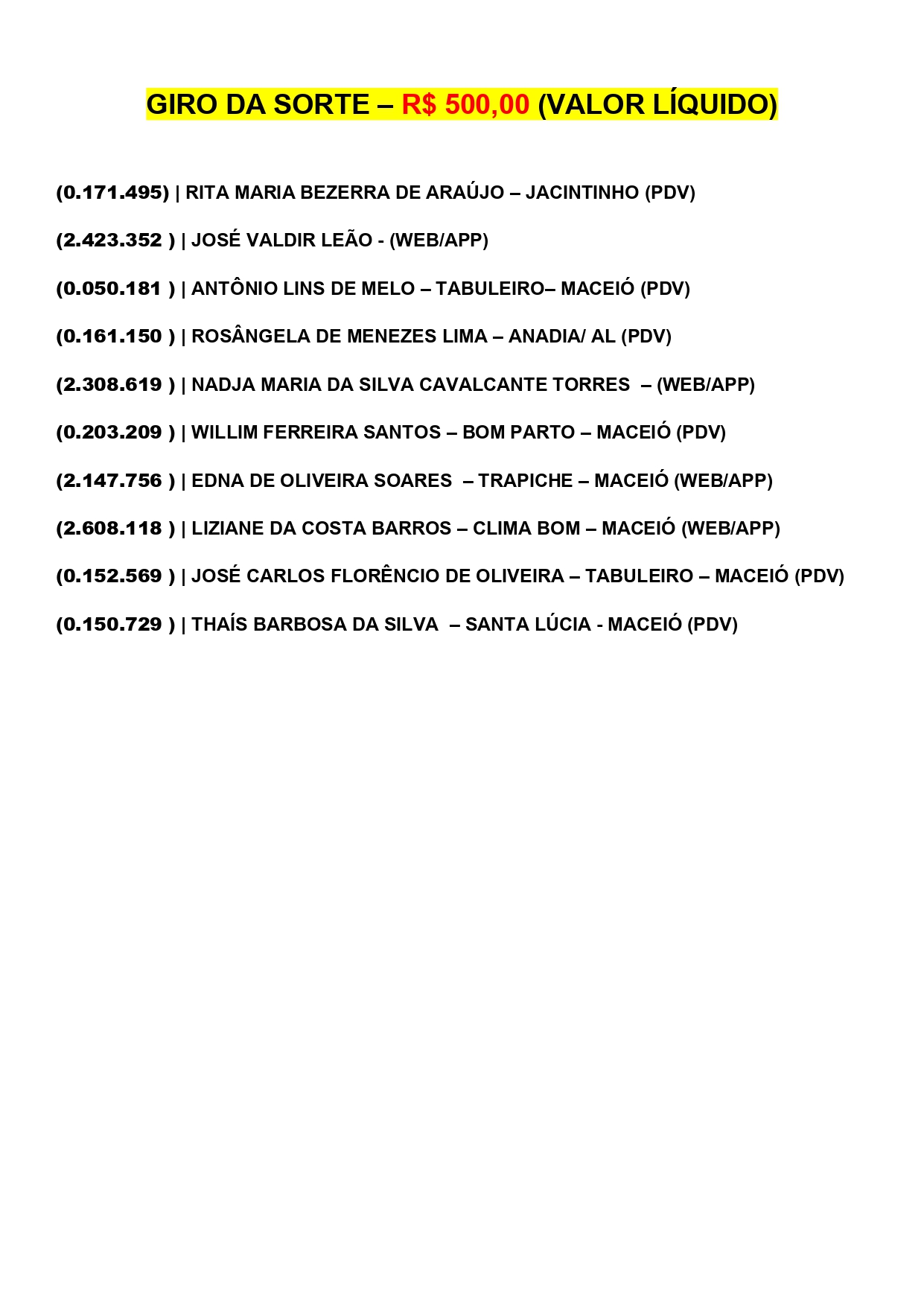 Veja os ganhadores do sorteio do Alagoas dá Sorte deste domingo, 23 de novembro