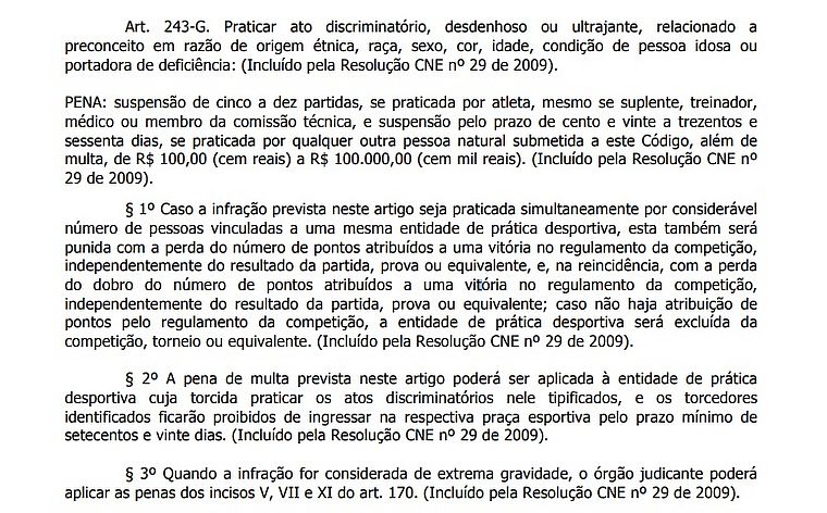 A pena também pode ser aplicada com perda de pontos em caso de reincidência e a pena de multa também cabe se a torcida do time praticar os atos discriminatórios. Veja na imagem abaixo.