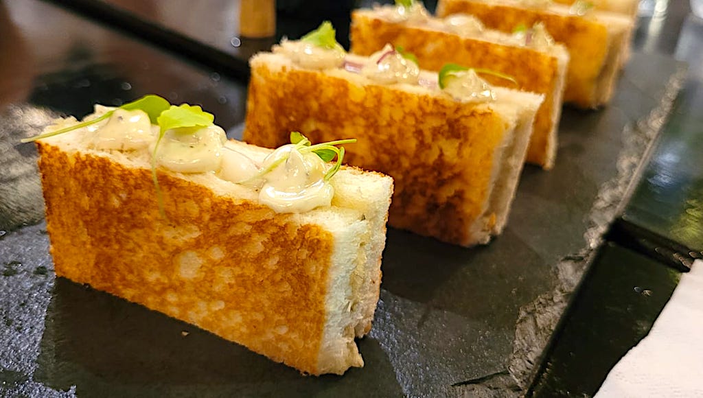 Pão de miga recheado de Jàmon (presunto) Serrano, mozzarella di búfala e mayo (maionese) de trufas negras.
