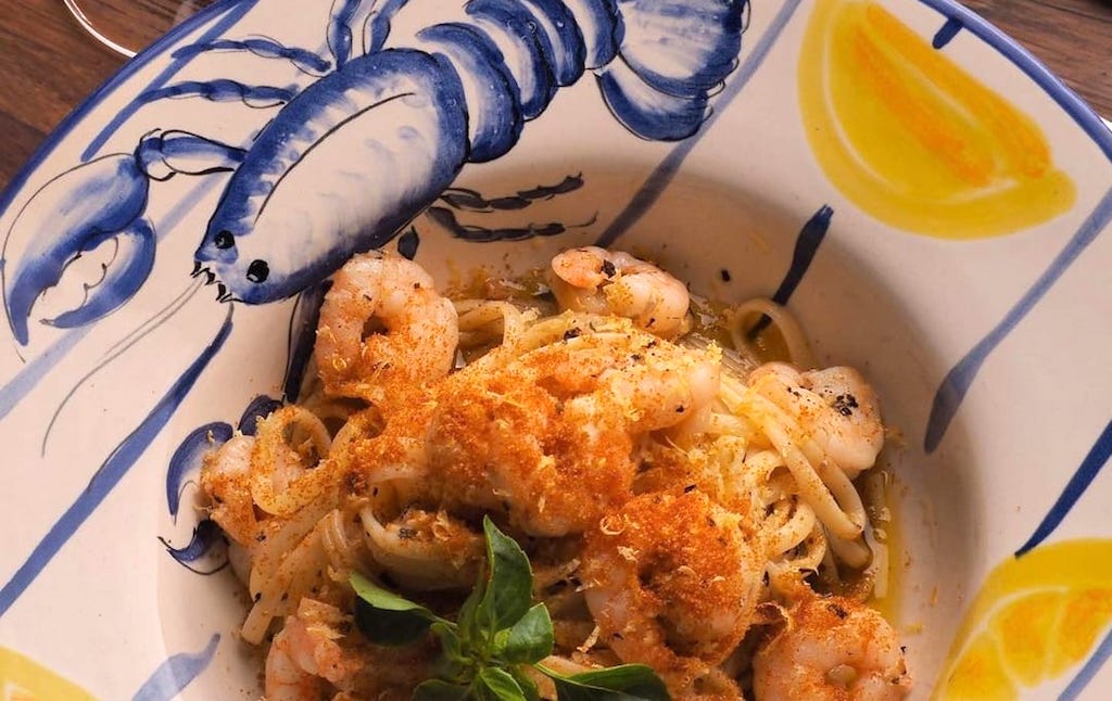 Gamberi di Provenza al Limone, linguine com molho de azeite, alho, alho poró, limão siciliano, salteado de camarões e raspas de limão siciliano